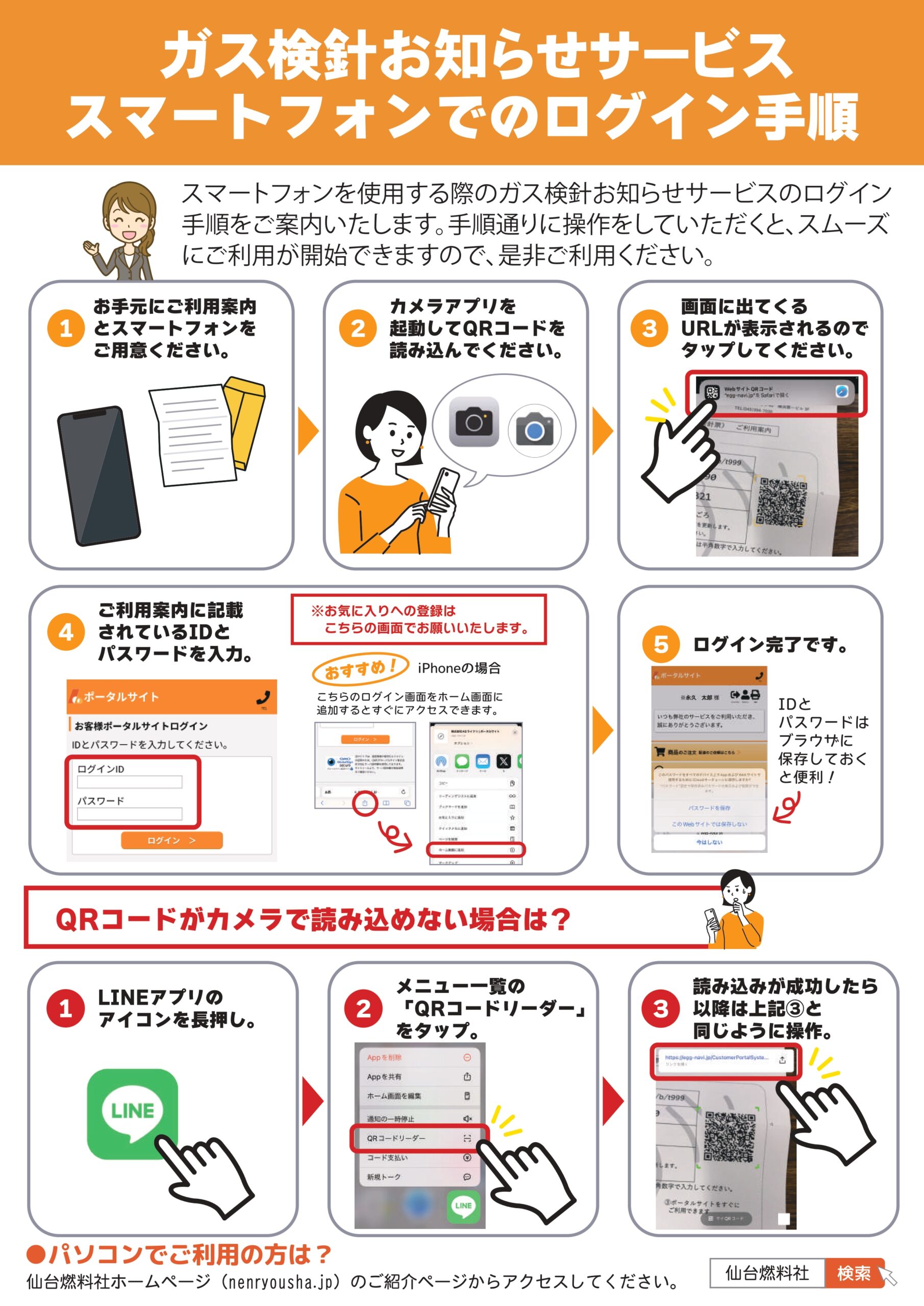 スマートフォンやパソコンからガス検針票がチェックできます。